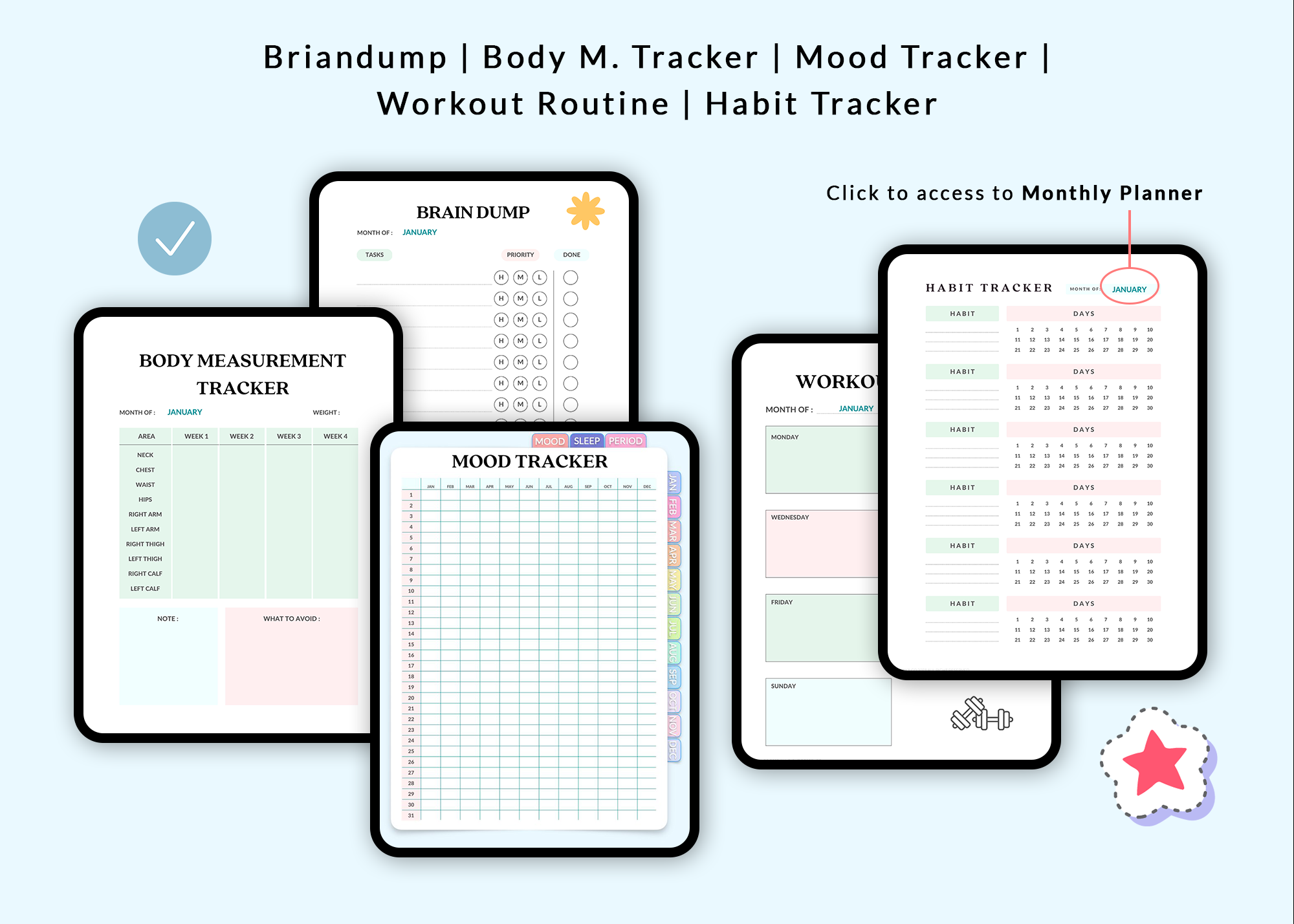 You'll have all the tools you need to stay organized and reach your goals with 646 pages of helpful organization tools. From yearly, weekly, and daily planners, to mood and sleep trackers, period calendars, expense and bill trackers, monthly budgets, annual finances, monthly previews, personal reflections, password trackers, life goals and goal-setting worksheets, workout routines, habit trackers, brain dumps, body measurements, meeting notes, project planners, and more notes .